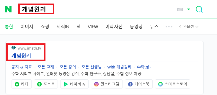 먼저 네이버 검색창에 "개념원리"라고 검색하신 후 상단의 공식홈페이지 링크를 선택해서 사이트에 접속을 해주세요.