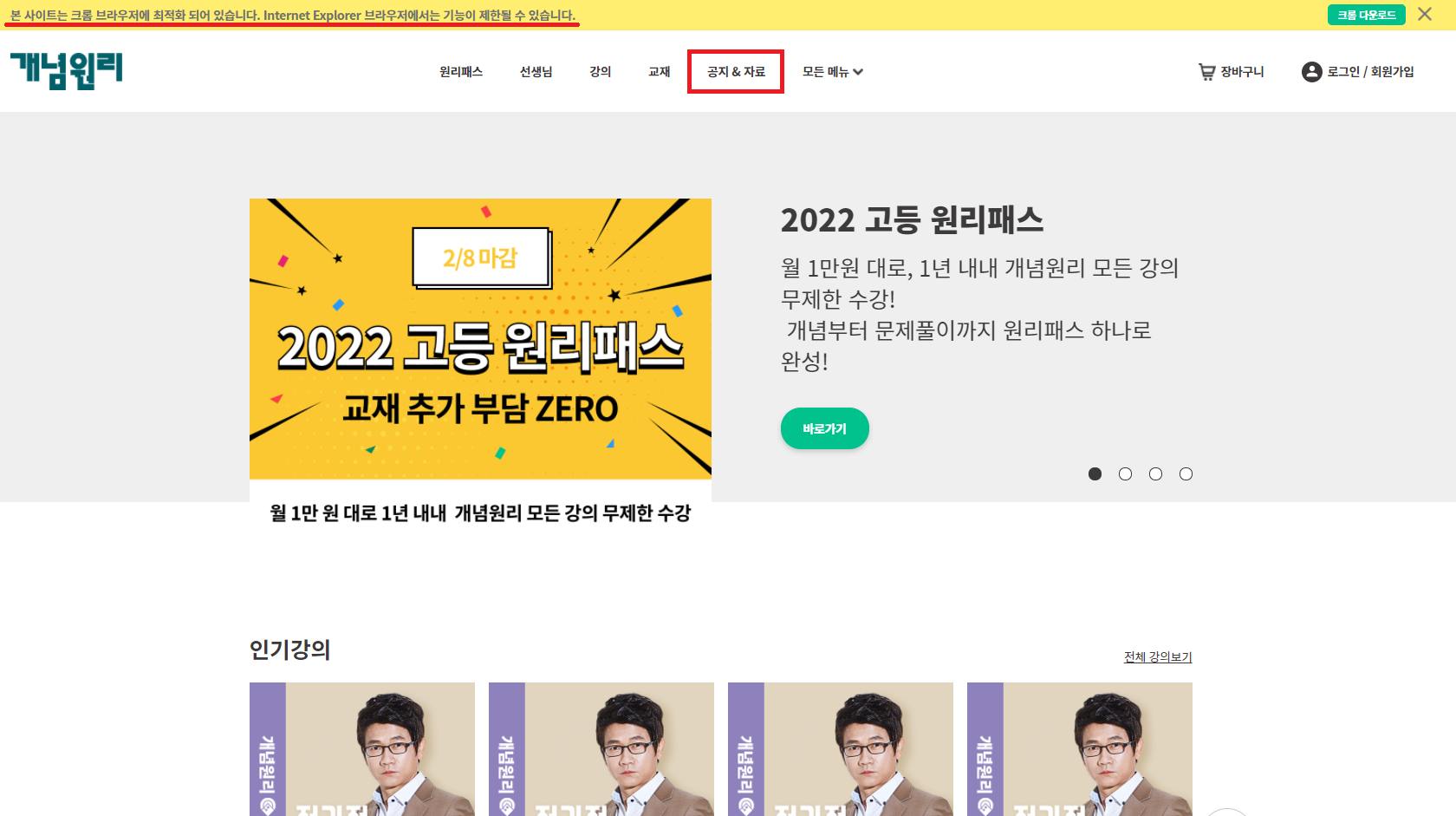열리더라도 자료실 화면을 들어가시면 흰색 공백 화면으로 나타납니다. 그래서 Chrome (크롬)브라우저 혹은 Microsoft Edge 브라우저로 사이트에 접속하시면 됩니다.그리고 또 상단 메뉴를 보시면 원리패스, 선생님, 강의, 교재, 공지&자료, 모든 메뉴 등 여러 개가 보입니다. 이 중에서 "공지&자료" 메뉴를 마우스로 선택해주세요.