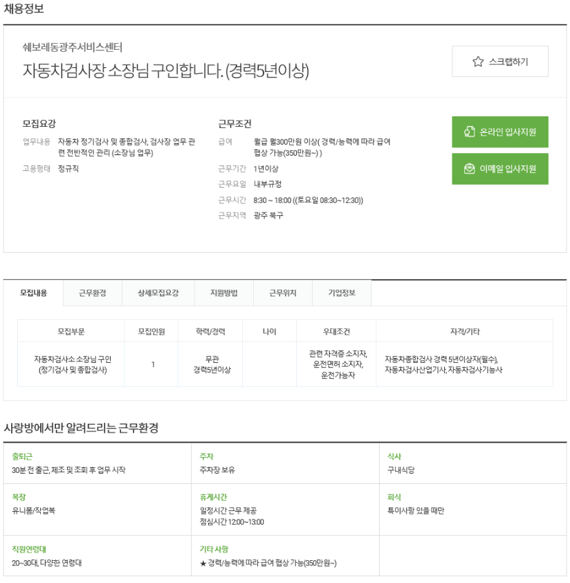 채용정보에 들어가시면 업무내용, 고용형태, 근무조건, 급여, 근무기간, 근무요일, 근무시간, 근무지역, 근무환경, 지원방법, 기업정보, 자격/기타,복지형태 등등 상세한 정보들이 나와있습니다. 잘 살펴보시고 본인이 원하시면 온라인 입사지원이나 이메일 입사지원으로 지원을 해주시면됩니다.