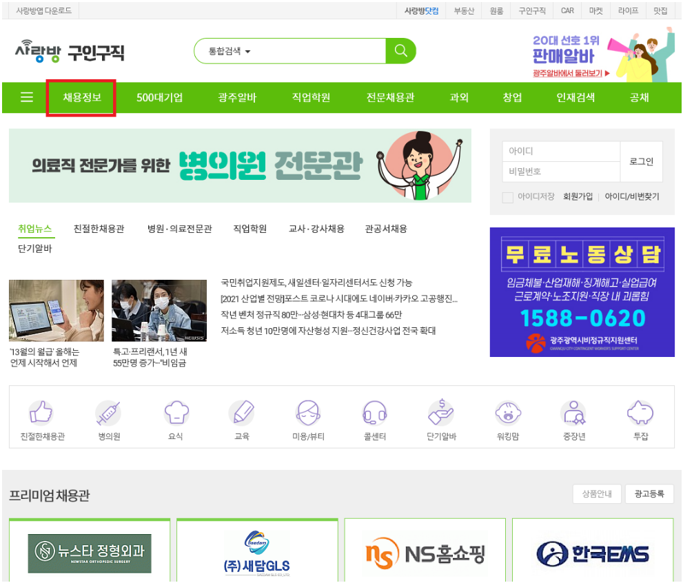 광주사랑방신문구인구직 사이트에 접속을 하시면 상단에 채용정보, 500대기업, 광주 알바, 직업학원, 전문채용관, 과외, 창업, 인재검색, 공채 등의 여러가지 메뉴가 보이실 겁니다.이곳에서 "채용정보"메뉴를 선택해주세요.