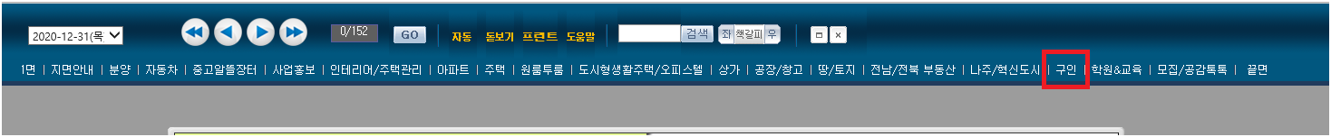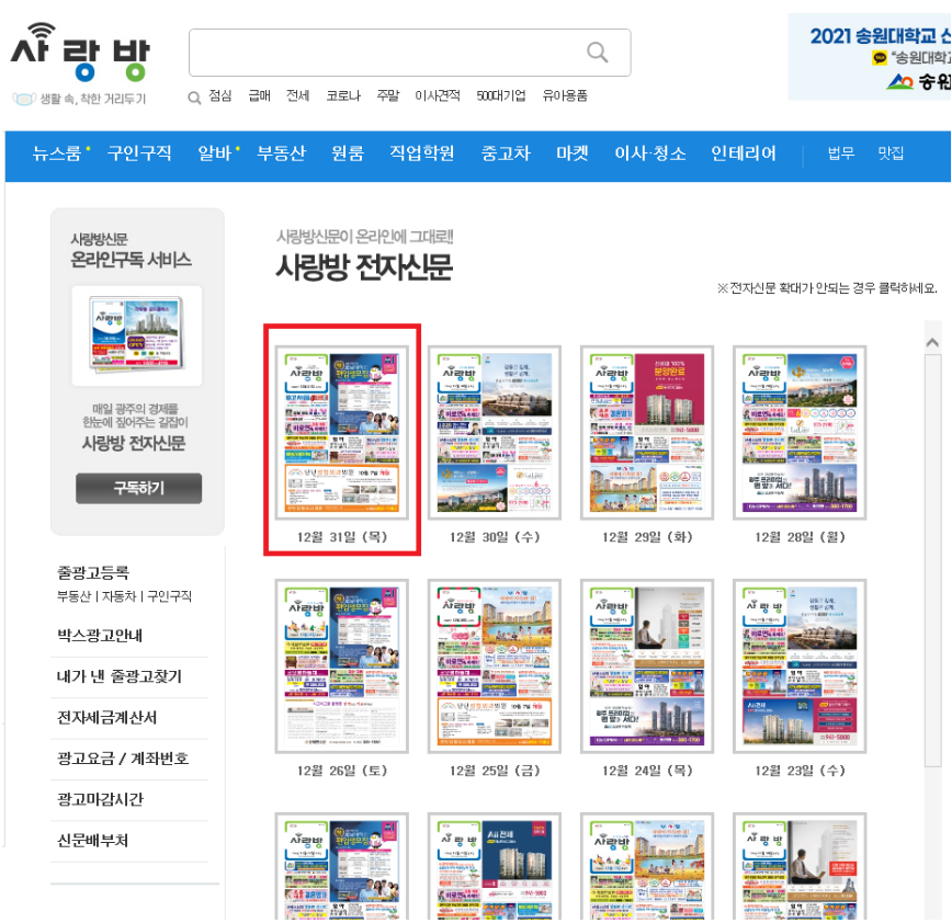 구인 메뉴를 선택하시면 신문의 페이지가광주사랑방신문 구인구직 정보가 모여있는 페이지로 넘어가게 됩니다.