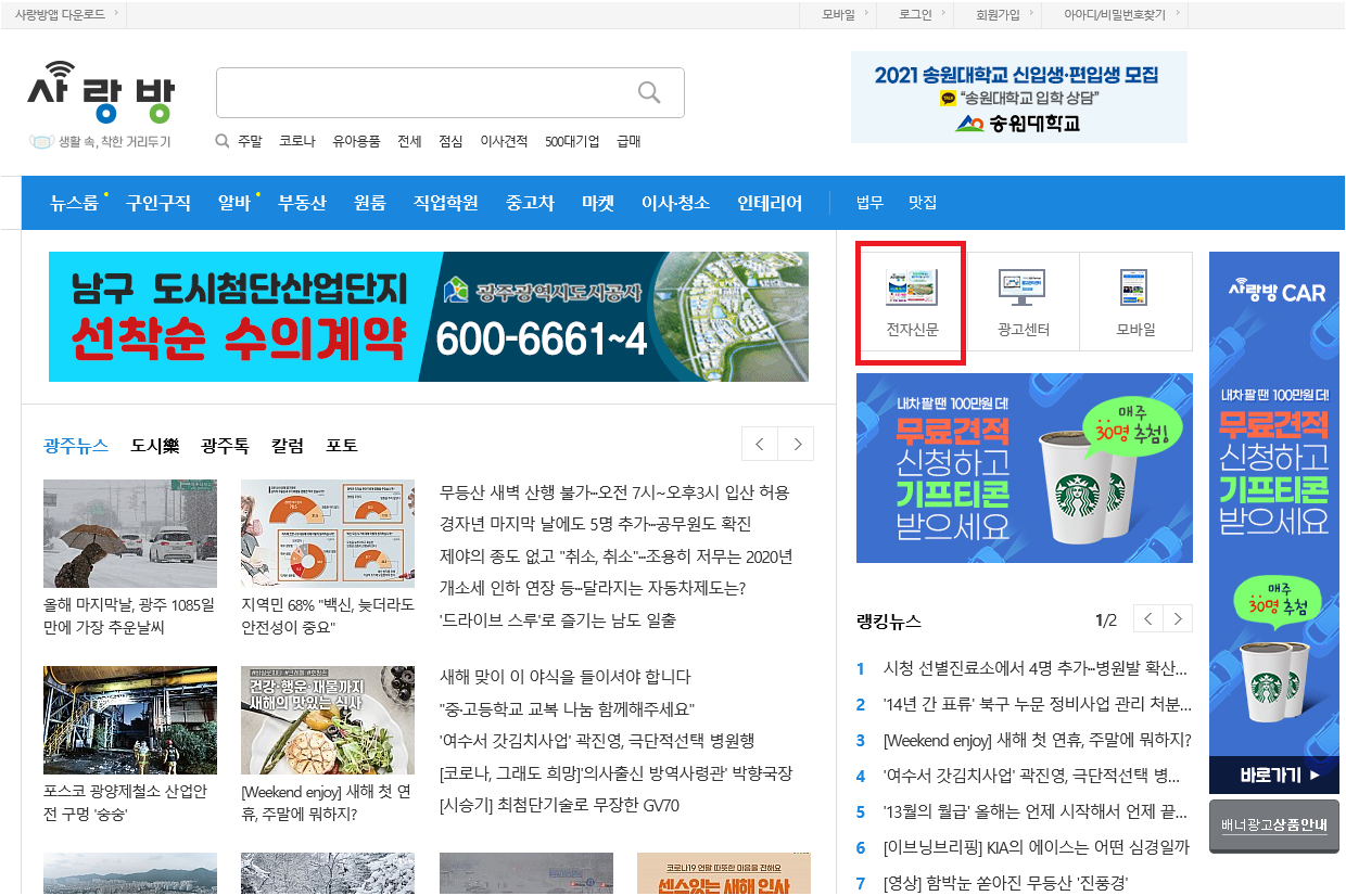 그러면 이렇게 광주사랑방 공식 홈페이지로 접속하게 됩니다.이곳 오른쪽에 상단쯤에 보시면 "전자신문"이라고 나와있습니다. 이 부분을 선택해주세요.