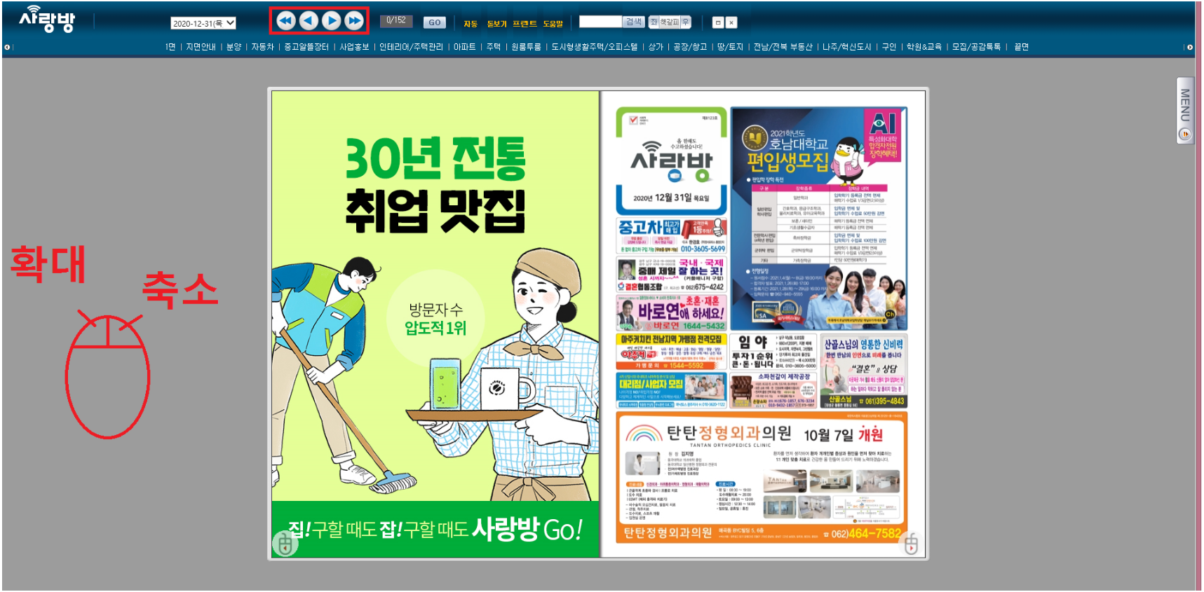 작은 신문을 선택하시면 전체 화면 창이 뜨면서 광주사랑방신문 페이지가 나타나게 됩니다.상단에 있는 화살표 버튼으로 신문의 페이지를 넘길 수 있으며, 마우스 왼쪽 클릭으로 확대, 오른쪽 클릭으로 축소를 할 수 있습니다.