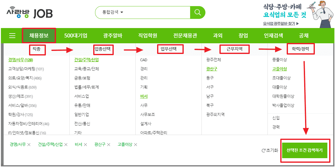 광주 사랑방잡(사랑방 JOB) 사이트에 접속을 하시면 상단에 채용정보, 500대기업, 광주 알바, 직업학원, 전문채용관, 과외, 창업, 인재검색, 공채 등의 여러 가지 메뉴들을 볼 수 있습니다. 여기서 구인구직을 하시려면 채용정보에 마우스를 가져가세요. 그러면 직종, 업종 선택, 업무 선택, 근무지역, 학력/경력 카테고리가 나타나고 여러 직종이 있습니다. 직종에는 경영/사무, 고객상담/마케팅, 의료/요양/복지, 외식/식음료