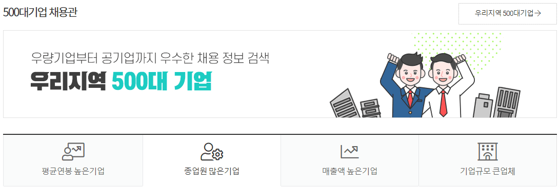 사랑방 JOB사이트에 있는 "500대 기업" 메뉴에는 우량기업부터 공기업까지우수한 기업의 채용정보를 찾을 수 있습니다. 평균 연봉이 높은 기업, 종업원이 많은 기업 매출액 높은 기업, 기업규모가 큰 업체 등 을 선택해서 상세하기 기업들을 분류해서 검색하실 수 있습니다.