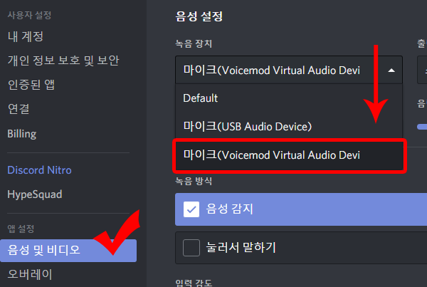 Voicemod를 활용해서 디스코드 음성변조하는 방법에 대해서 알려드리겠습니다. 정말 간단합니다. 디스코드 설정에서 아래의 화면처럼 녹음장치를"마이크(Voicemod Virtual Audio Device)"로 변경해주세요. 그런 다음 다시 Voicemod로 돌아가서 변조시키고 싶은 음성필터를 선택해주세요. HEAR MY VOICE는 OFF로 다시 바꿔주고, VOICE CHANGER만 ON상태로 두시면 됩니다. 정말 간단하죠?