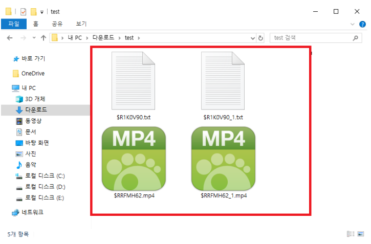 삭제된 파일이 검색되었으면복구할 파일을 선택해주시면 됩니다. mp4 동영상 파일과 txt문서 파일을 복구해보겠습니다.