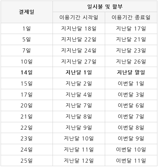 14일을 납부일로 하면 월급을 받고 나서 조금 지난 뒤이기 때문에 결제금액이 부족한 경우가 생겨서 낭패를 보는경우가 있습니다.