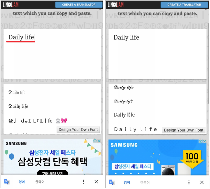 Daily life라는 문구를 한번 적어봤습니다. 그러면 아래와 같이 문구 적는 란 하단 두 번째 칸에 다양한 글씨체들이 나타나게 됩니다. 이 중에서 본인이 원하는 문구를 복사해서 피드를 올릴 때 붙여 넣기 해주시면 됩니다. 정말 간단하죠?^^
