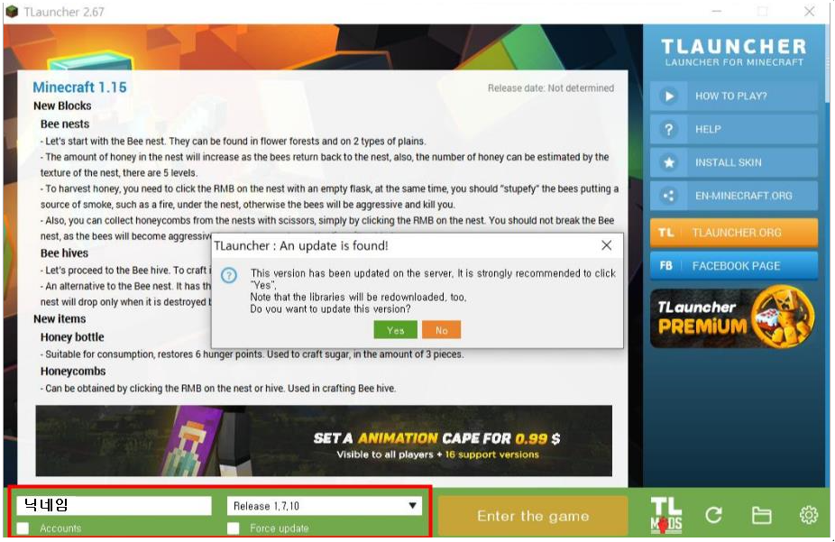 설치가 모두 끝나면 런처를 실행합니다.이미지에 표시된 부분에 닉네임을 넣고 마크 게임하기 위한 버전을 선택합니다.Release 1.7.10을 선택 하면 됩니다. 게임을 실행하면 업데이트가 있다고 나오는데 No를 선택합니다. 우리가 설치하고 싶은건 마크 1.7.10 설치니까요. 만약 마크 계정이 없다면 MOJANG 계정 만들기를 실행하면 됩니다. 이메일 주소만 있으면 되는 거라 금방 만들 수 있습니다.