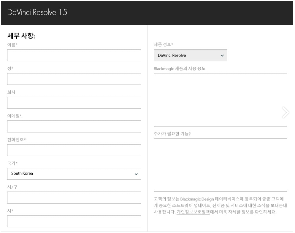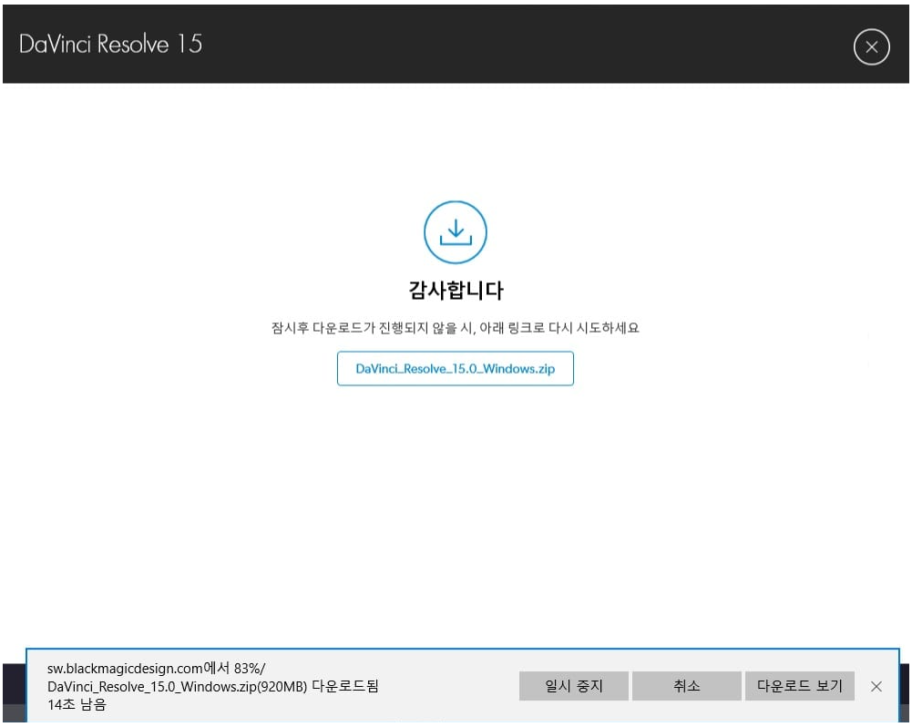 여기까지 입력이 끝나셨으면 다빈치 리졸브의 다운로드가 시작됩니다.다운로드가 바로 시작되지 않으면 직접 버튼을 꾸욱!! 하셔서 다운로드를 해주세요.