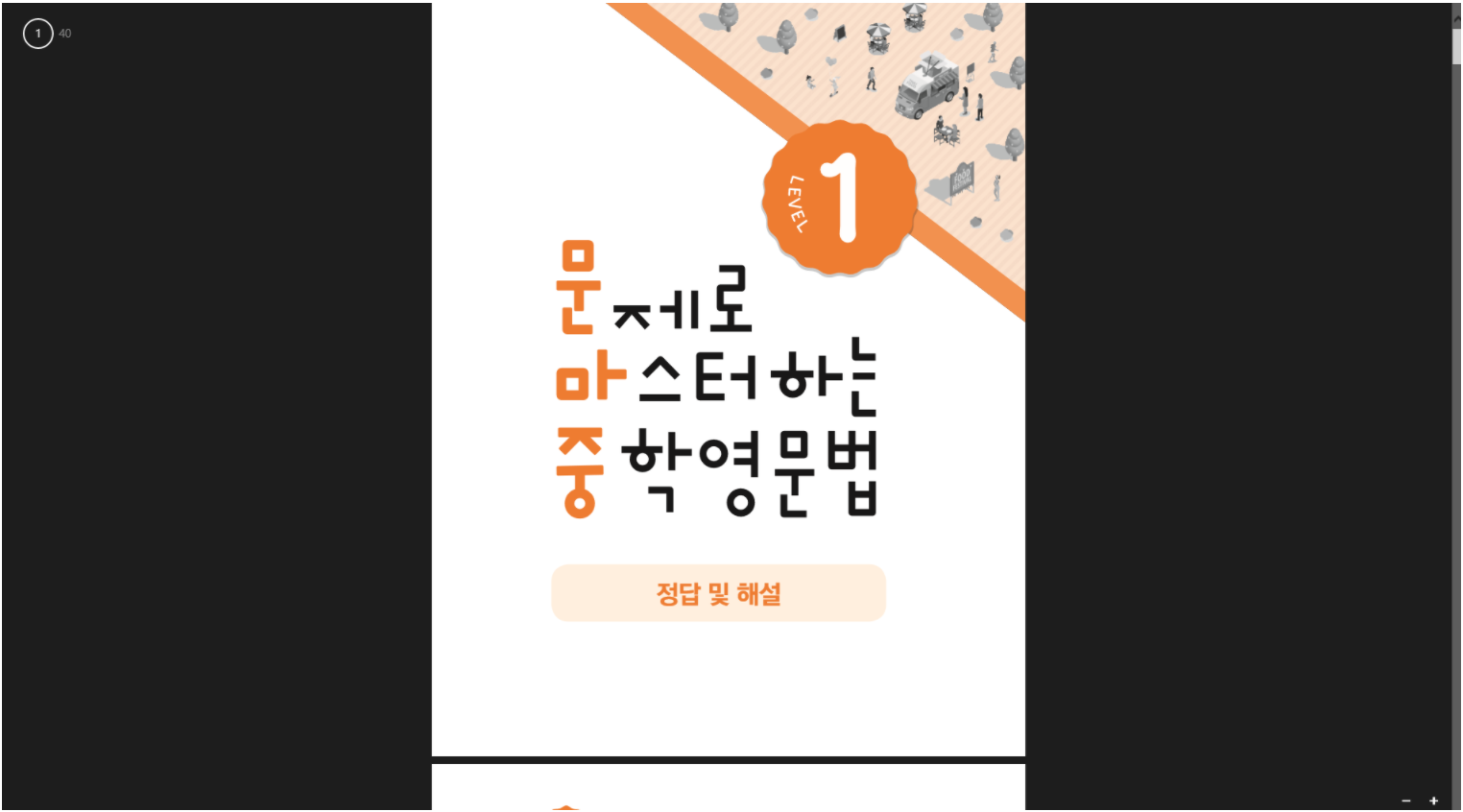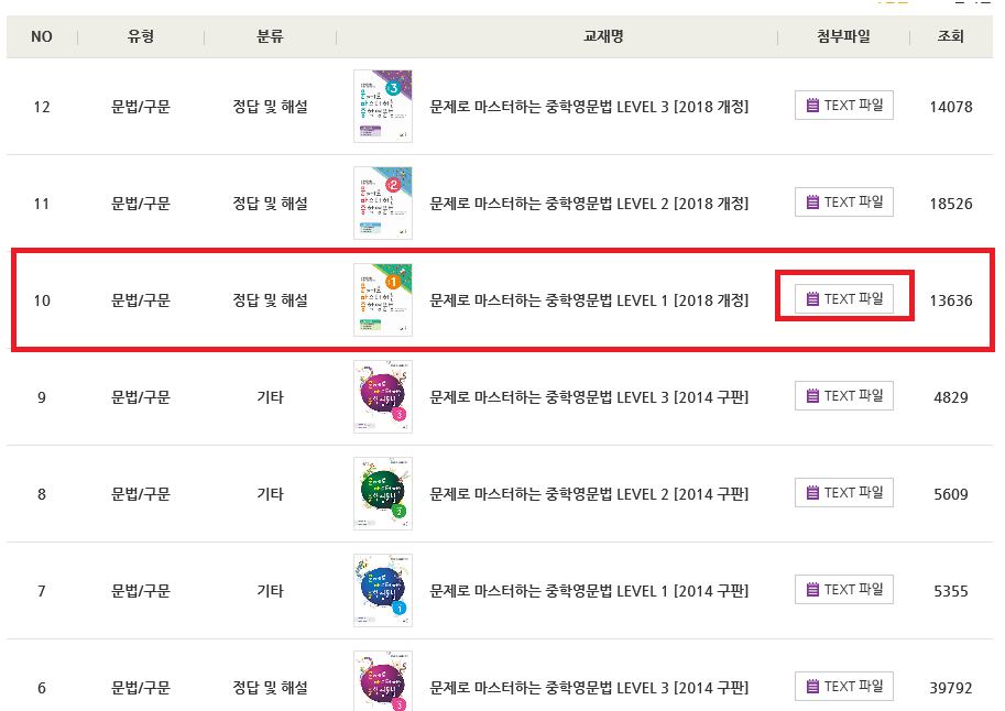 이처럼 여러개의 학습 자료들이 나옵니다. 2014년 구판과 2018년에 출시된 개정판이 나옵니다. 여기서 "문제로 마스터하는 중학영문법 LEVEL 1"(2018 개정) 판이 있습니다. 첨부파일에 있는 "TEXT" 버튼을 선택해보세요.