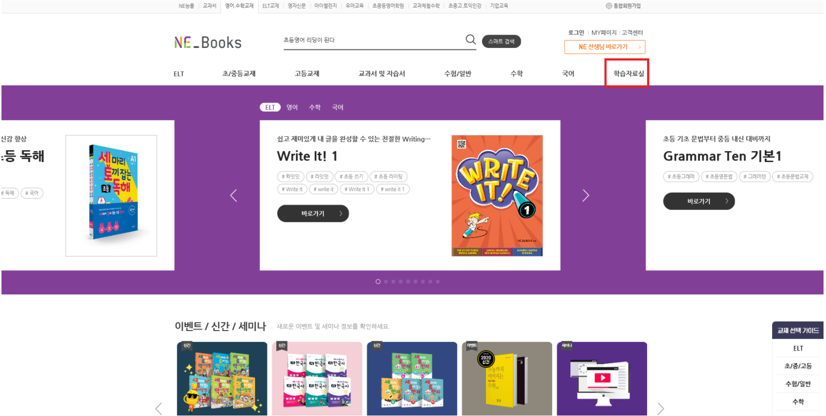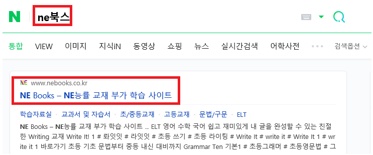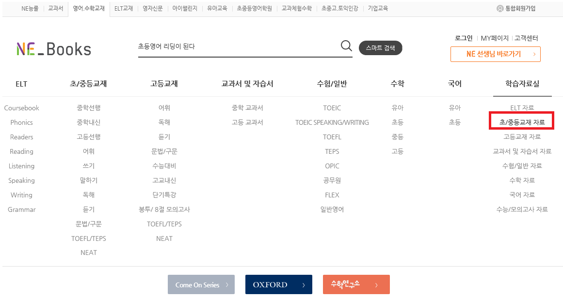 NE_books 메인화면 홈페이지가 나타납니다. 이곳에 상단에 보시면 ELT, 초/중등교재, 고등교재, 교과서 및 자습서 등등