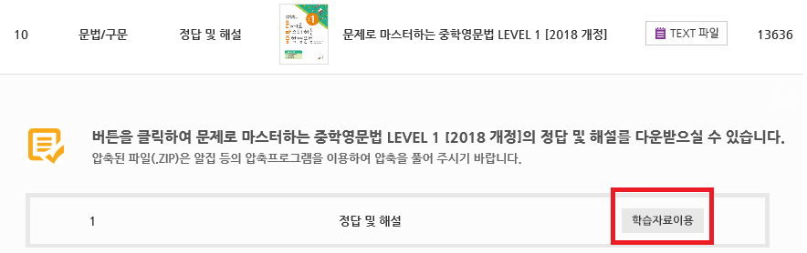 TEXT 버튼을 선택하시면 이렇게 하단에 "학습자료 이용"버튼이 나타납니다. 선택을 하셔서 문마중1 답지를 다운로드받아주세요.