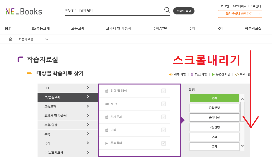 초/중등교재 자료 항목을 선택하시면 학습자료실 페이지로 이동이 됩니다.대상별 학습자료 찾기 - 정답 및 해설, mp3, 부가 문제, 기타, 무료 강의 등이 화면에 나오는데요. 여기서 스크롤을 아래로 내려보세요.