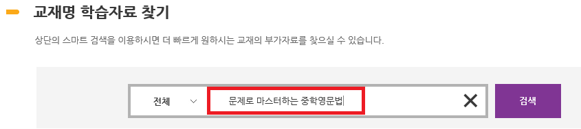 스크롤을 조금만 내려보시면 교재명 학습자료 찾기라고 써져 있는 곳 아래에 네모난 검색란이 있습니다. 문마중1 답지를 다운로드하기 위해서는 여기에 "문제로 마스터하는 중학영문법"이라고 검색을 해주세요.