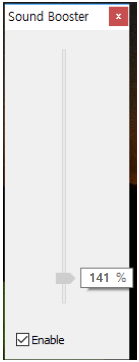 사운드 부스터 프로그램을 실행하시면, 왼쪽의 사진처럼 오른쪽 하단에 작은 아이콘으로 작업표시줄에 나타납니다. 그리고 Enable 버튼을 사용해서 '사운드 증폭 효과'를 켜고, 끌 수 있습니다.