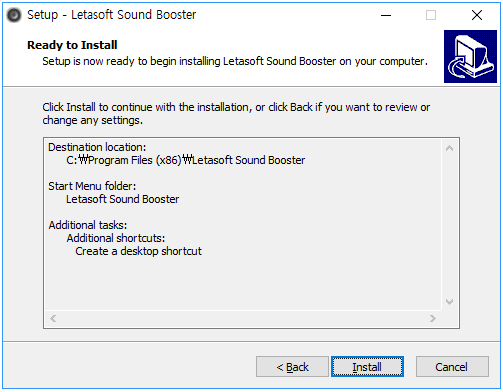 그리고 이런 창이 나오는데, 이화면은 사운드 부스터 프로그램을 바탕화면에 '바로가기'아이콘으로 만들 건지 물어보는 것입니다. 이것도 설정한 다음 'Install'을 마지막으로 프로그램 설치는 끝이 납니다.