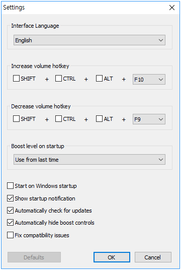 그리고 오른쪽 사진을 보시면, 사운드 부스터 설정창입니다. 이곳에서는 업데이트를 자동으로 할 것인지 수동으로 할 것인지 설정하거나 소리의 크기를 조절하며, 단축키를 설정할 수 있는 기능이 있습니다. 본인에게 설정하여 사용하시면 됩니다.