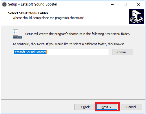 사운드 부스터 프로그램의 설치경로를 묻는 창이 나옵니다. 여기서 본인이 설치할 곳을 정한 다음 'Next'버튼으로 넘어가 줍니다. 그런 다음 오른쪽의 사진처럼 Start menu(시작 메뉴)에 추가할 것인지 물어봅니다. 이것도 그냥 넘어가 줍니다.
