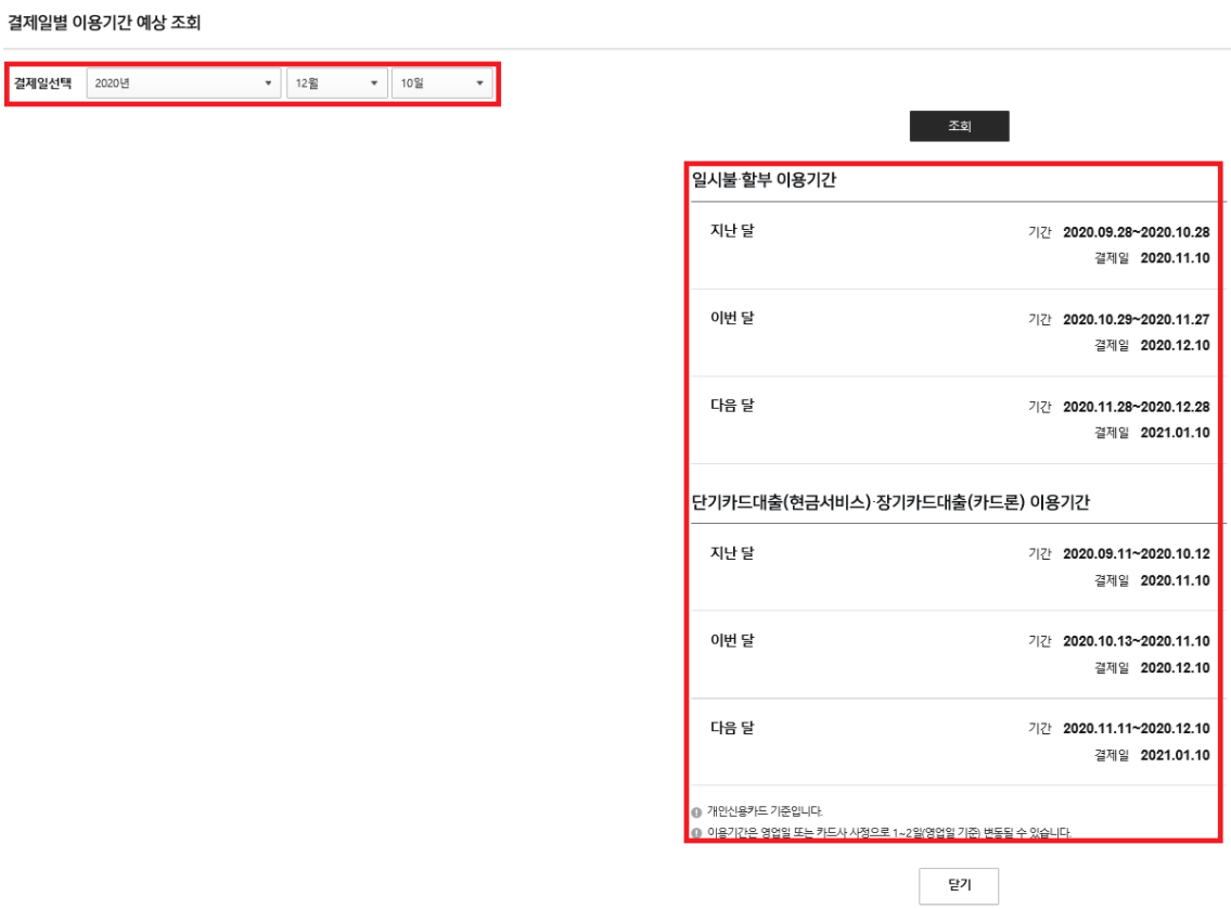 아래의 그림을 보시면 11월 10일 결제일의 이용기간과 12월 10일 결제일의 이용기간이 조금 다른 것을 확인할 수 있습니다. 결제일 전월이 30일인지 31일인지에 따라 기간이 조금 변경됩니다.