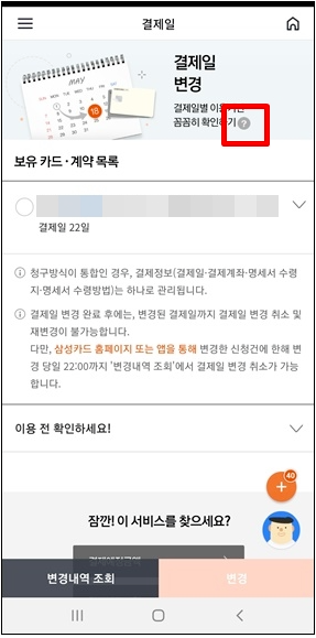 모바일 결제일 변경 메뉴에서도 삼성카드 결제일별 이용기간 확인이 가능합니다. PC와 마찬가지로 로그인하신 후 오른쪽 물음표 버튼을 선택하세요.
