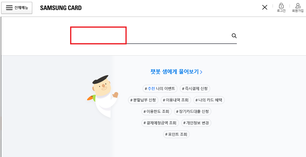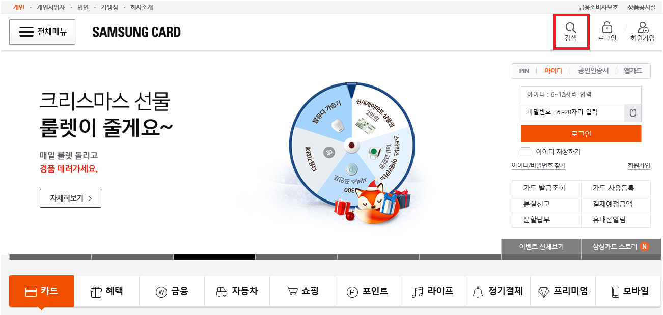 삼성카드 공식 홈페이지에 접속하시면 아래와 같이 화면이 나타나는데요. 여기서 오른쪽 상단에 보시면 "검색" 메뉴가 있습니다. 선택을 해주세요.