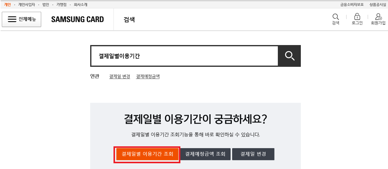 결제일별 이용기간이라고 검색을 하시면 결제일별 이용기간 조회, 결제 예정금액 조회, 결제일변경 이렇게 세 가지 메뉴가 보이실겁니다. 삼성카드 결제일별 이용기간을 확인하기 위해서 결제일별 이용기간 조회 버튼을 선택해주세요.