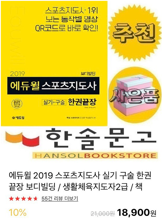 안녕하세요! 저의 생활체육지도사 2급구술/실기 시험후기를 작성해보겠습니다. 저는 실기 책을 필기와 마찬가지로 "애듀윌"에서 출판한 책을 구매했습니다. 저는 21,000원 주고 샀는데, 지금 보니 할인 들어가서 18,000원이네요;;ㅠㅠ