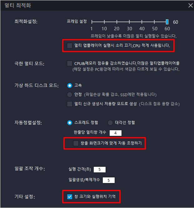 멀티 최적화를 설정하는 화면입니다. 가장 먼저 "멀티 앱 플레이어 실행 시 소리 끄기, CPU 적게 사용됩니다." 항목의 체크를 해제시켜주세요. 그렇지만 본인의 컴퓨터 사양이 낮은 저사양 컴퓨터라면 체크를 해주세요. 두 번째 "창을 화면 크기에 맞게 자동 조정하기" 항목에도 체크를 해제시켜주세요.