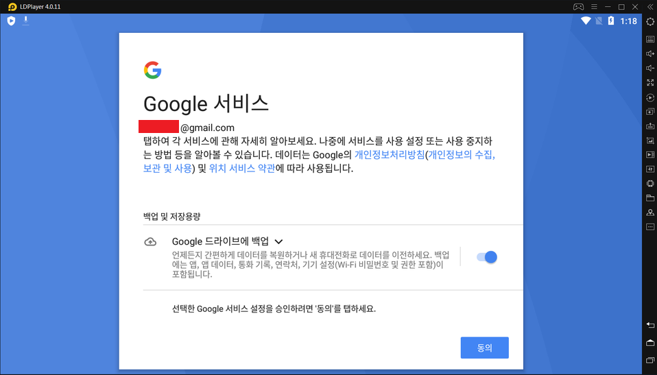 비밀번호까지 입력해서 로그인을 하시면 구글 서비스 화면이 나타나고 드라이브 백업을 할지 말지 여부를 물어봅니다. 여기서 "동의"를 선택해서 진행을 해주세요.