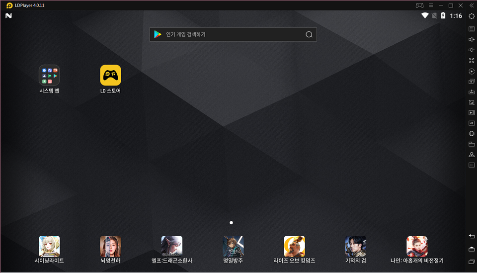 엘디 플레이어 4.0를 실행하시면 이렇게 가로로 프로그램이 열립니다. 이제 엘디 플레이어 4.0 최적화 세팅을 알려드리겠습니다.