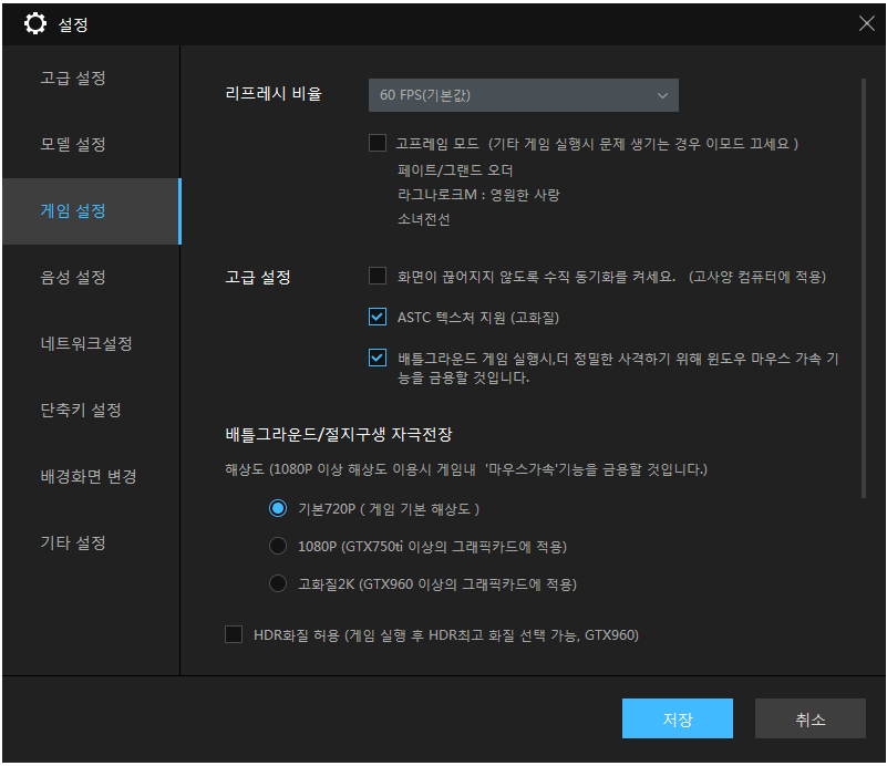 이곳 게임 설정값은 본인이 사용하는 게임에 따라서 조금씩 달라질 수 있습니다. 또 상기 화면은 4.0 기준이기에 4.0 버전 이하의 경우에는 메뉴가 조금 다를 수 있습니다. 게임에서 60 FPS값은 RPG 게임에서 매우 적정한 수준입니다. 리니지 M 같은 경우에는 기본적으로 고프레 임모 드는 체크하고 사용하시는 게 좋으며, 고급설정 또한 사양이 좋은 경우에만 첫 번째 옵션을 켜셔야 합니다.그 외 배틀그라운드를 제외한 RPG 게임에서는 특별하게 최적화를 하실 필요가 없습니다.