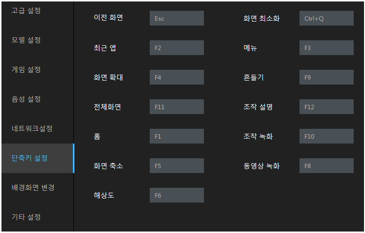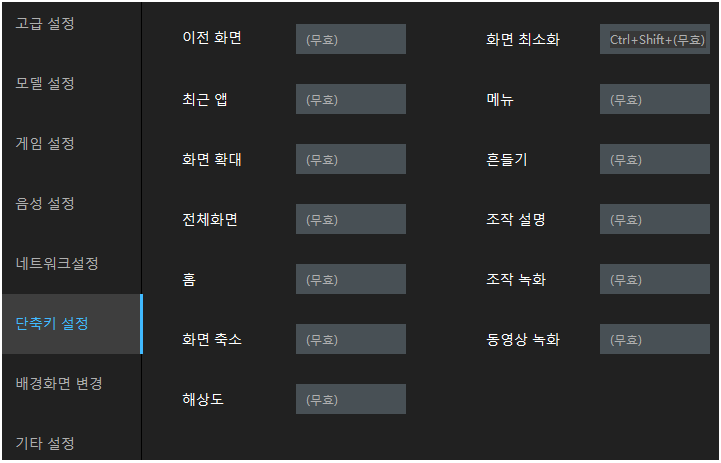 단축키 설정인데요. 이것을 설정하는 이유는 매크로 및 키보드 설정을 게임 내에서 할 때중복 키값으로 문제가 될 수 있기 때문입니다. 아래에 보이시는 화면이 단축키 설정의 기본값입니다.