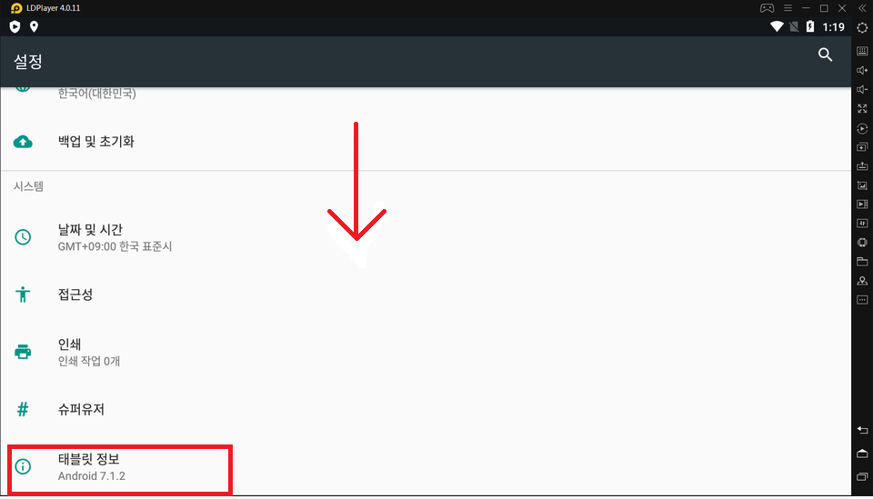 그러면 이렇게 태블릿 상태로 이동하게 되고 스크롤을 맨 아래로 내려보시면 "빌드번호"가 나옵니다. 여기에 있는 "빌드번호를" 5번 선택하세요. 메시지로 1단계 2단계... 이렇게 나오고 5단계가 되면 완료됩니다.