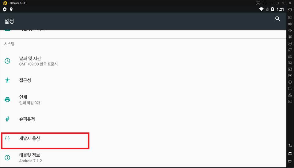 그리고 다시 "설정"화면으로 가시면 "개발자옵션"이 활성화되어있습니다.개발자 옵션을 선택해주세요.