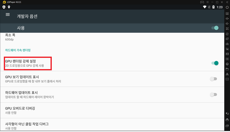 개발자옵션을 들어가시면 "GPU 렌더링 강제설정"이라는 곳이 있습니다. 오른쪽 끝에 있는 버튼을 선택해서 활성화시켜주세요.이전의 버전과 달리 엘디 플레이어 4.0 버전에는 여기까지만 해도 됩니다.이이상 최적화할 필요가 없어졌습니다.