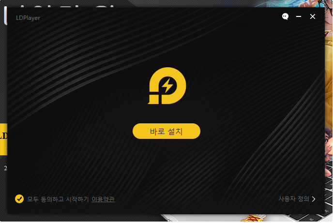 다운로드하신 엘디 플레이어 4.0 설치 파일을 실행시키시면 아래와 같이 설치 화면이 나타납니다. 이곳에서 "바로 설치" 버튼을 선택해서 다운로드를 실행해주세요.
