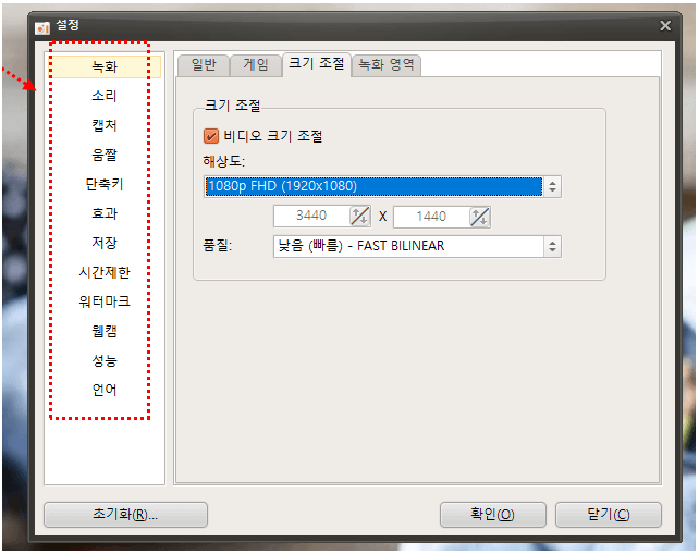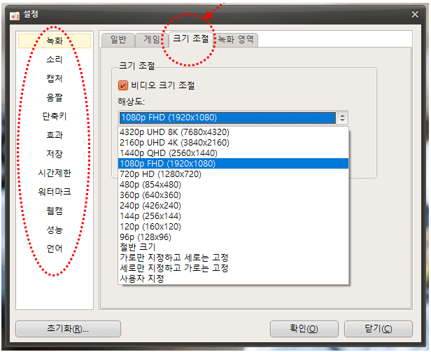 녹화 화면 크기 조절 방법을 예시로 설명드리면, 특별한 이유가 아니면 1080p FHD(1920X1080)으로 설정해주신 다음 사용하시면 됩니다.