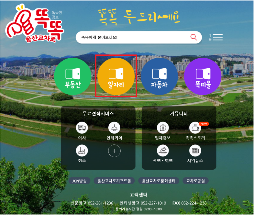 접속을 하시면 이렇게 홈페이지 메인 화면이 나타납니다. 이곳에 보시면 부동산,일자리,자동차,똑띠몰 등등 여러 메뉴가 있습니다. "일자리"메뉴를 선택해주세요.