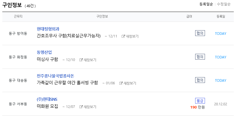 검색을하시면 이렇게 근무지와, 급여, 등록일 등의 구인정보가 나오는걸 볼 수 있습니다.