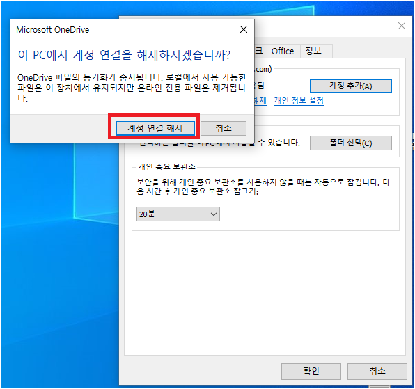 그러면 "이 PC에서 계정 연결을 해제하시겠습니까?" (OneDrive 파일의 동기화가 중지됩니다. 로컬에서 사용 가능한 파일은 이 장치에서 유지되지만 온라인 전용 파일은 제거됩니다.)라는 문구와 창이 뜹니다. 여기에서 "계정 연결 해제" 버튼을 선택해서 동기화를 해제시켜주세요.