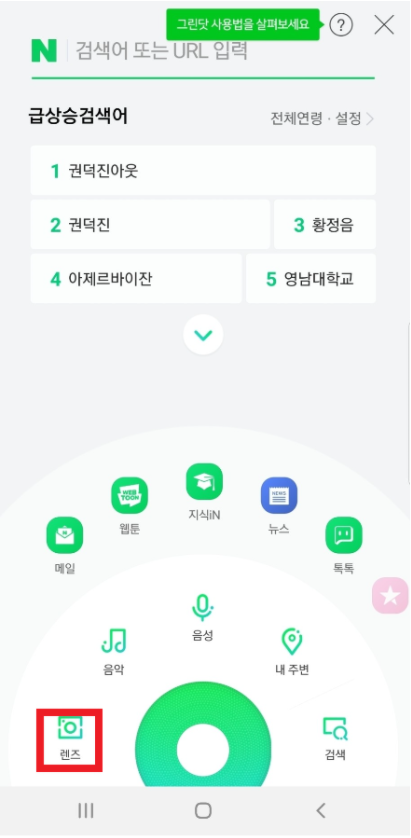 요즘 큐알코드를 많이 사용하는 시대입니다. 정사각형의 URL로 이미지나 지도, 사이트 같은 것을 첨부할 수도 있고숫자, 문자만 인식하는 기존의 바코드보다 훨씬 다양하게 사용할 수 있습니다. 먼저 큐알코드 스캔을 하시기 위해서는 네이버 어플을 들어가 주세요.네이버 어플이 없으시다면 구글 애플리케이션에서다운로드 받아주신다음 실행을 해주세요. 실행해주시면 아래와 같이 네이버 화면이 보이실 겁니다.중앙에 초록색 원형이 있죠??그걸 선택하세요.