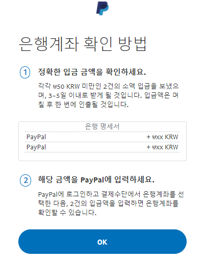 은행 정보를 모두 입력하셨다면 본인 확인을 위해서 페이팔에서 소액의 금액을 입금해줍니다. 기간은 3~5일 정도 소요되고 입금된 소액은 며칠 뒤에 다시 빠져나갑니다. 소액이 입금되셨다면 오른쪽의 화면처럼 입금된 금액을 입력하신 뒤 확인을 해주시면 페이팔 은행계좌 연결이 끝납니다.