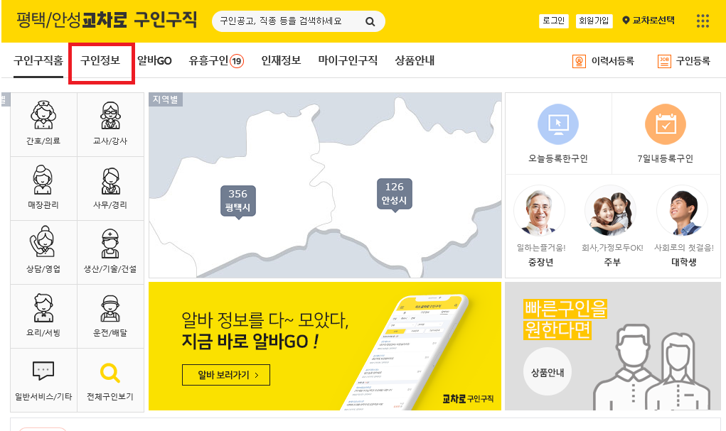 구인구직 항목을 선택하시면 평택 교차로 구인구직 사이트로 이동이 됩니다.이곳 상단에 구인구직 홈, 구인정보, 알바 GO, 유흥 구인, 인재정보, 마이 구인구직, 상품 안내 등의 메뉴들이 보이시는데요. 여기에서 "구인정보" 메뉴를 선택해주세요.