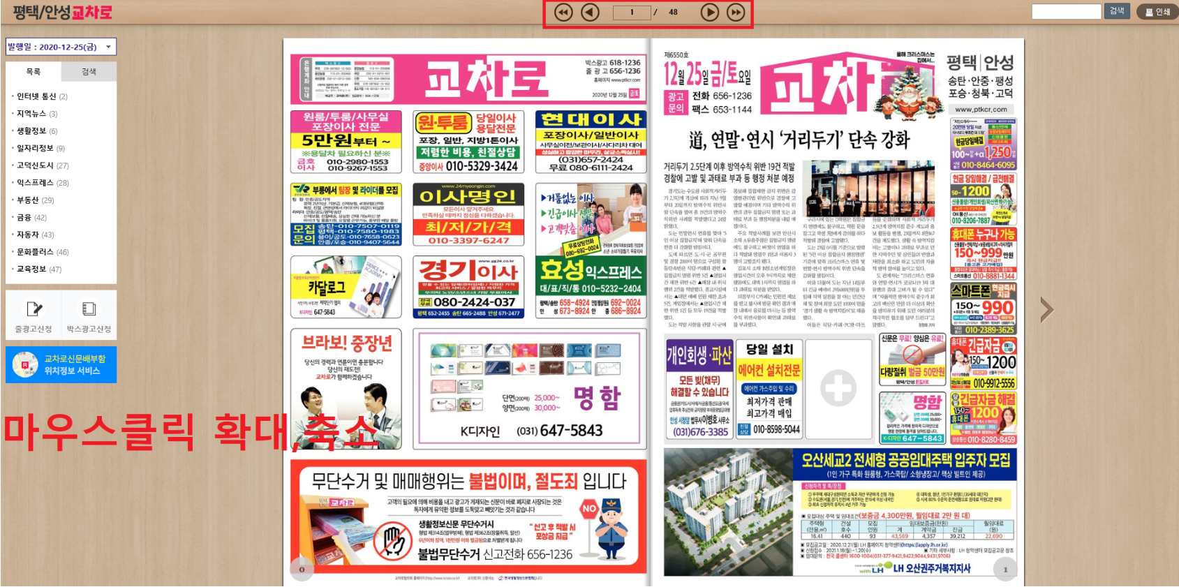 작은 신문을 선택하시자마자 전체 화면 창이 나타나면서 신문 페이지가 열립니다. 상단에 있는 화살표 버튼으로 신문의 페이지를 넘길 수 있으며, 마우스 클릭으로 확대, 축소를 할 수 있습니다.