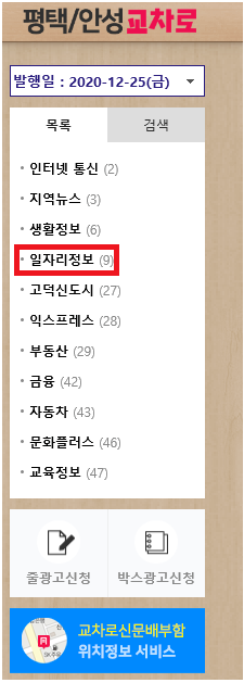 일자리정보 메뉴를 선택하시면 신문의 페이지가 평택 교차로 구인구직 정보만 모아놓은 페이지로 신문이 넘어가게 됩니다.