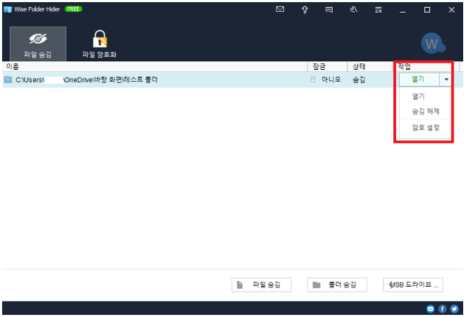 "작업" 메뉴로 폴더를 열기/ 숨김 해제/ 암호 설정을 하실 수 있습니다. 프로그램을 닫으면 설정한 폴더의 경우 자동으로 숨김이 되고 프로그램을 실행하셔야만 폴더를 확인하실 수 있습니다.
