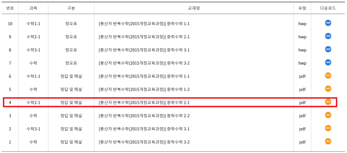 그러면 풍산자 반복 수학 2-1 답지의 정오표와 정답 및 해설 자료들이 아래의 화면과 같이 나열되어서 나타납니다. 여기에는 우측에 있는 다운로드 항목의 파란,노란 버튼을 통해서 pdf파일 유형과hwp 파일 유형의 여러 자료들을 다운로드하실 수 있습니다. 4번에 있는 풍산자 반복 수학 2-1 답지를 오른쪽의 노란색 버튼을 선택해서 다운로드를 진행해주세요.