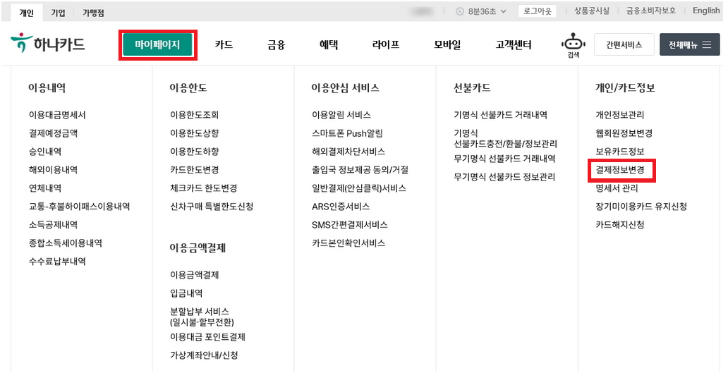 하나카드 결제일 변경 방법입니다. 먼저 하나카드 공식 홈페이지로 접속을 해주세요. 그런 다음 로그인을 해주신 다음 상단에 있는 "마이페이지" 메뉴를 선택하시고 "결제정보 변경" 항목을 선택해주세요. 아이디가 없으시면 회원가입을 먼저 해주세요. 가입할 때는 카드번호를 입력해야 하니 미리 준비하시는 게 좋습니다.
